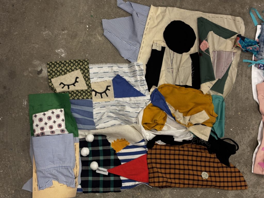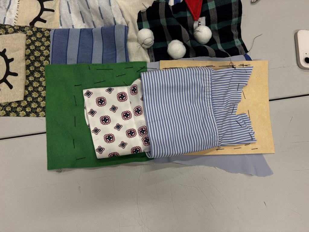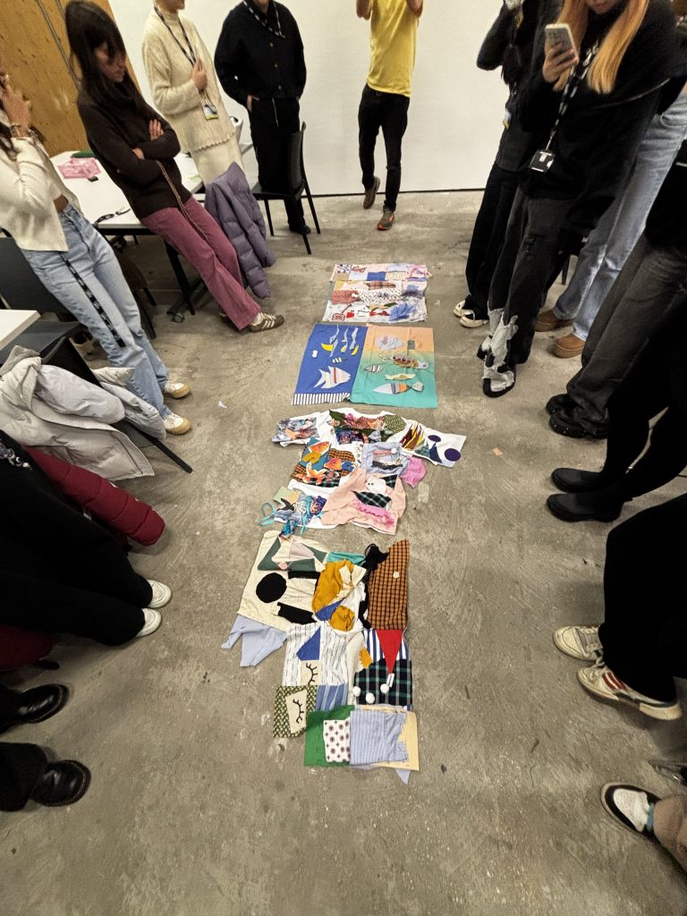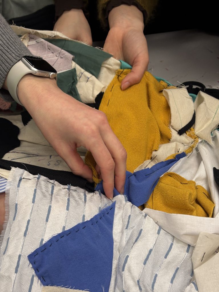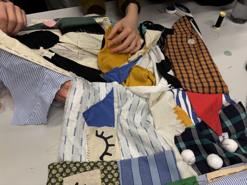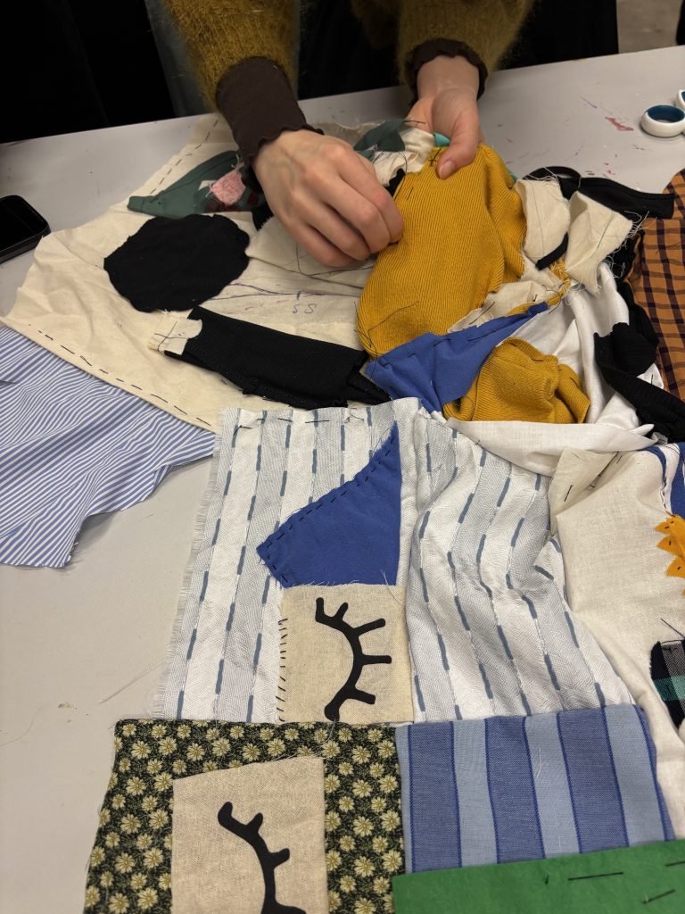 In this studio, we worked together in a group and made a quilt. This was also the first time I tried sewing, I did know about it, knew how to do it, but this was the day I did it practically. Our brief was to think about our experience at Central Saint Martins and visualise it with thread and found materials, stitching them together, and at the end, making a quilt by sewing together pieces from everyone in smaller groups. The final outcomes were very abstract and visually engaging. Here are some images from the studio session.