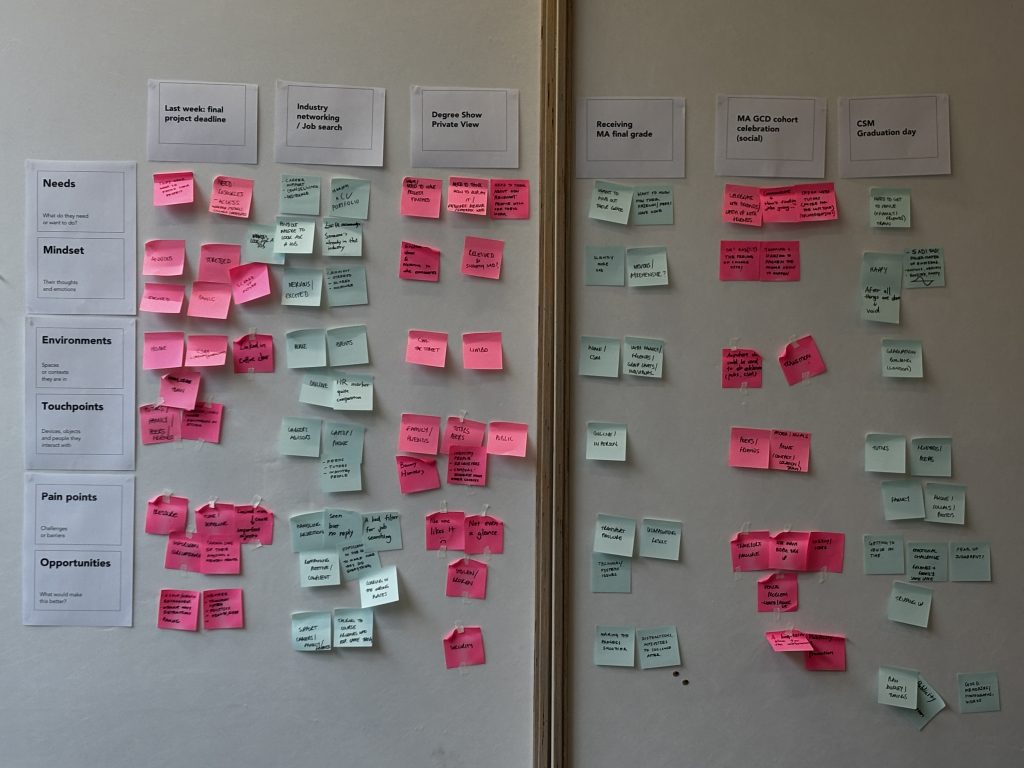 We were divided into groups of three to four students, and given sample user personas, and two problem statements that related to the student’s experience at UAL to investigate. I had the chance to work with two amazing people, our problem statement was to investigate the weeks leading up to graduating from UAL. We created an experience map using sticky notes and sharpies. (tip: use sharpies as it makes it easier to put down thoughts quicker). The goal of an experience map is to identify the different associations in the stages of a process under investigation.
