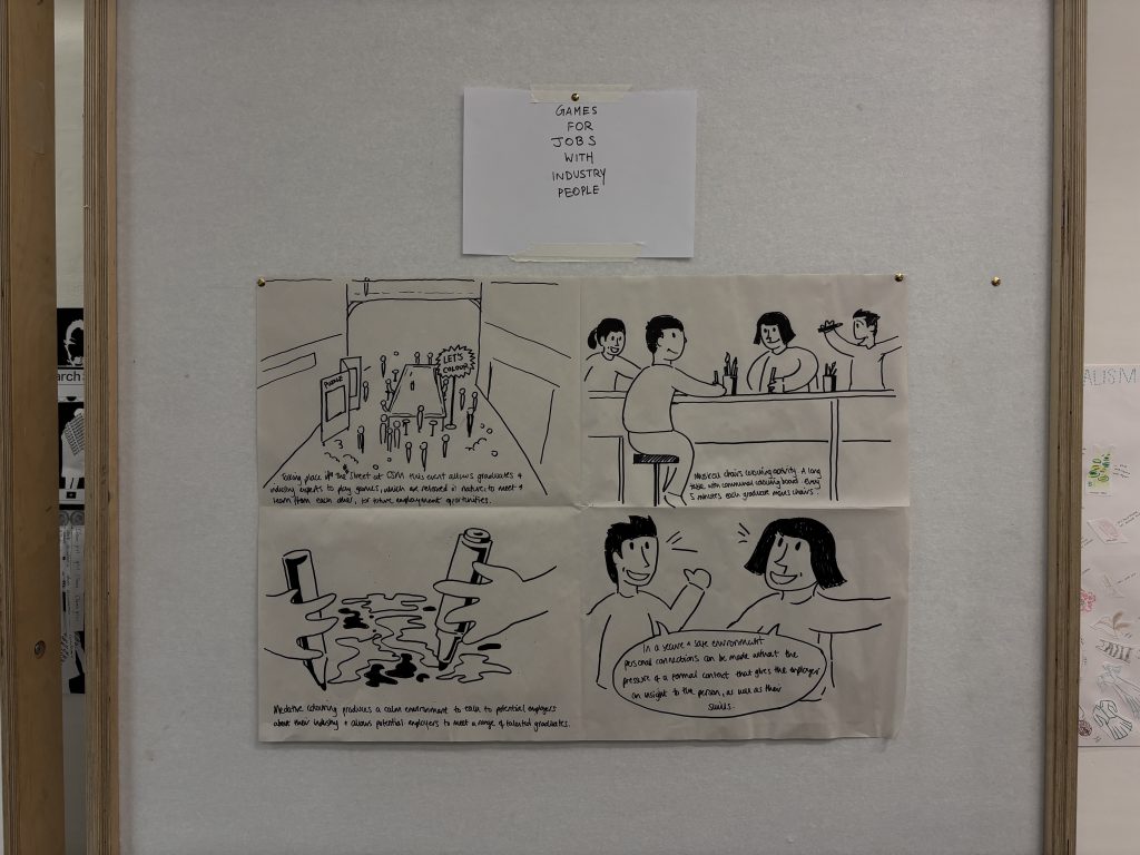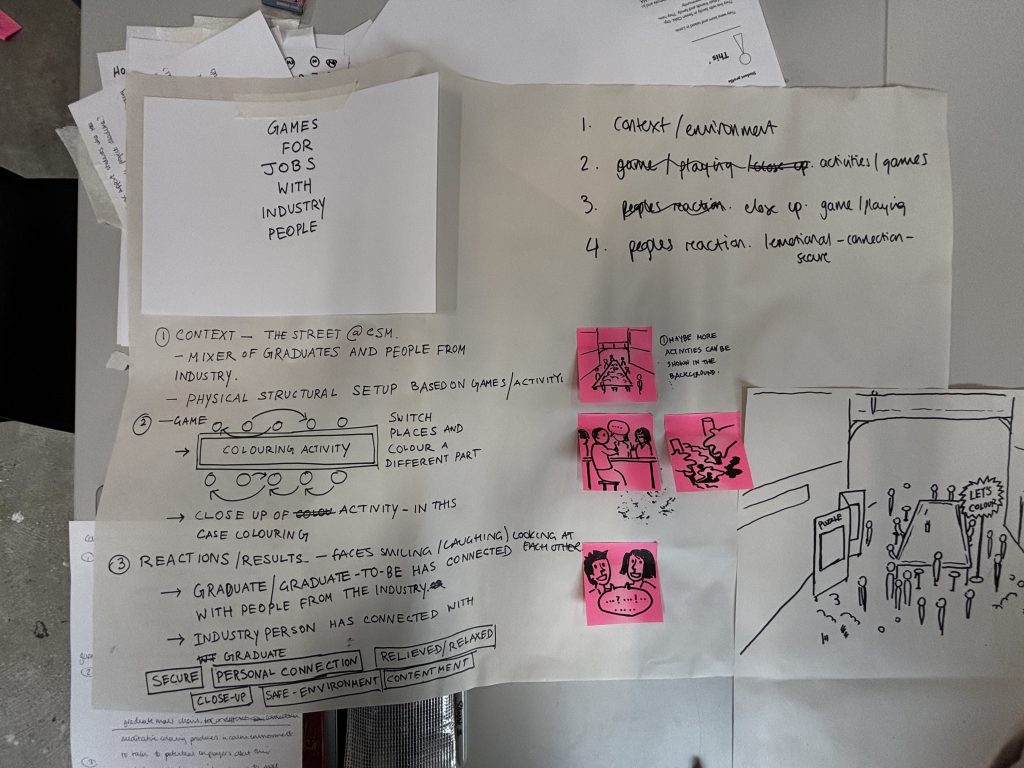 Our thought was developed around the exposure to industry the students of CSM had access to and how might we create a better experience for the students at large. To this, our solution was this idea of organising an event, almost like a play day, which would be host to different activities and collaborative events, enabling organic interactions between students/ graduates and people from the industry. This is how the final ideation looked like. Here we show an activity involving painting different parts of a bigger picture, while changing positions and interacting with the people around, kind of like ‘musical chairs’. The workshop ended with a presentation of our work as groups with thoughts & inputs from our tutors.