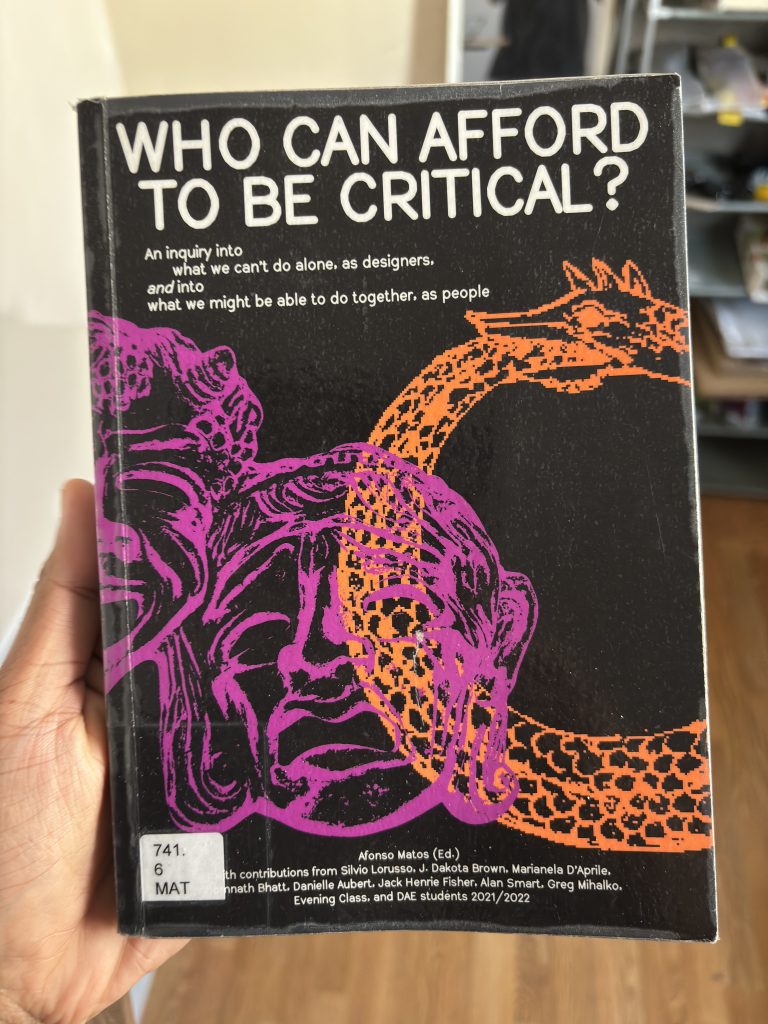 The cross-years studio on Industry and Precarity was an eye opener. I came across a publication by Afonso Matos, Who can afford to be critical. The recorded conversations and thoughts about critical design, graphic design and industry and precarity in the book, were similar to conversations I had with my peers a year back.